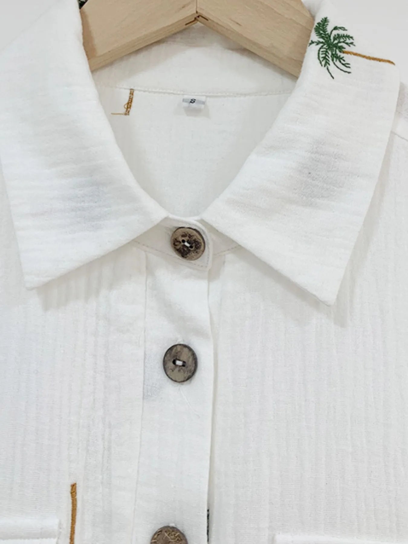 Palm Tree Print Short Sleeve Button-Up Romper with Belt