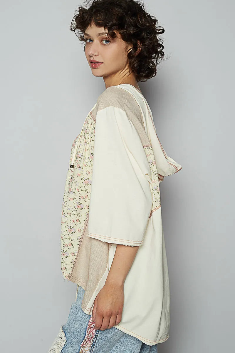 This bohemian-inspired T-shirt features a unique lace-up front neckline and vintage floral print panel inserts that create a romantic, feminine aesthetic. Made from soft cotton blend material, it offers comfortable breathability with three-quarter sleeves and a relaxed fit. The cream base color with delicate floral accents makes it perfect for casual wear, layering, or creating effortless boho-chic looks. The distinctive lace-up detail adds a fashion touch while the vintage-inspired print panels provide visual interest and texture contrast.